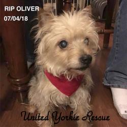 7/4/18 On Wednesday, July 4th, Oliver was having a very difficult time breathing, coughing, hacking and not getting enough oxygen as evidenced by his tongue turning blue. He was rushed to the emergency vet in Carbondale, IL as we are visiting family in Southern IL. He suffered a bad heart, collapsed trachea and was blind. The emergency Vet said his heart was "thick" and dramatic changes were taking place, complicated by the collapsed trachea and gallstones which had never shown up in any x-rays prior. They put him on oxygen and gave him medication to calm and relax him. There was virtually nothing they could do to save him. He died peacefully with me by his side, knowing he was loved. What a great little boy he was and so happy all the time. He was a great little traveler and enjoyed camping trips in the travel trailer. He is very much loved and missed but playing happily at the rainbow bridge with his many pup friends. I would like to thank UYR for giving me the opportunity to be a part of his life